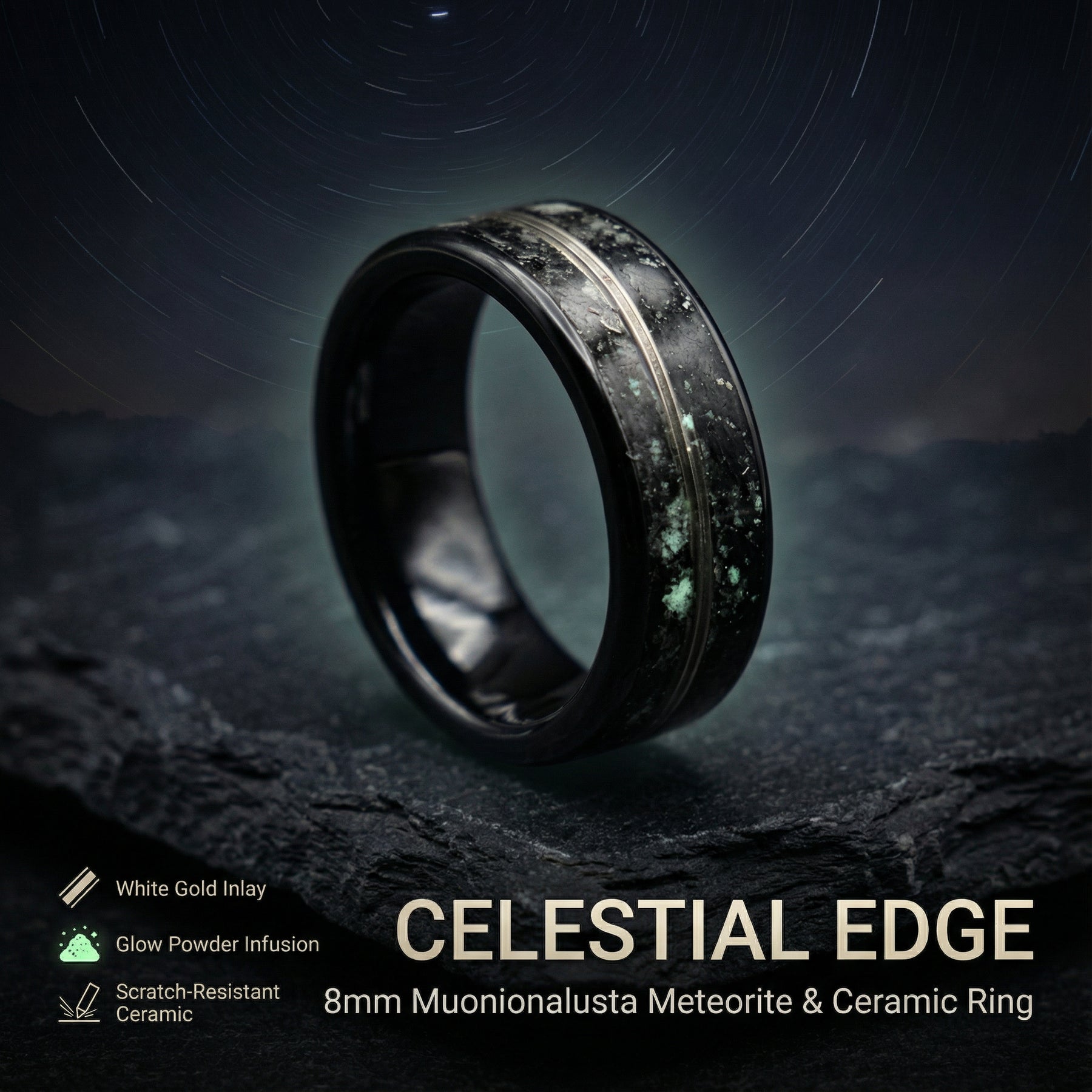 Glow in the Dark Meteorite Ring White Gold Inlay Details