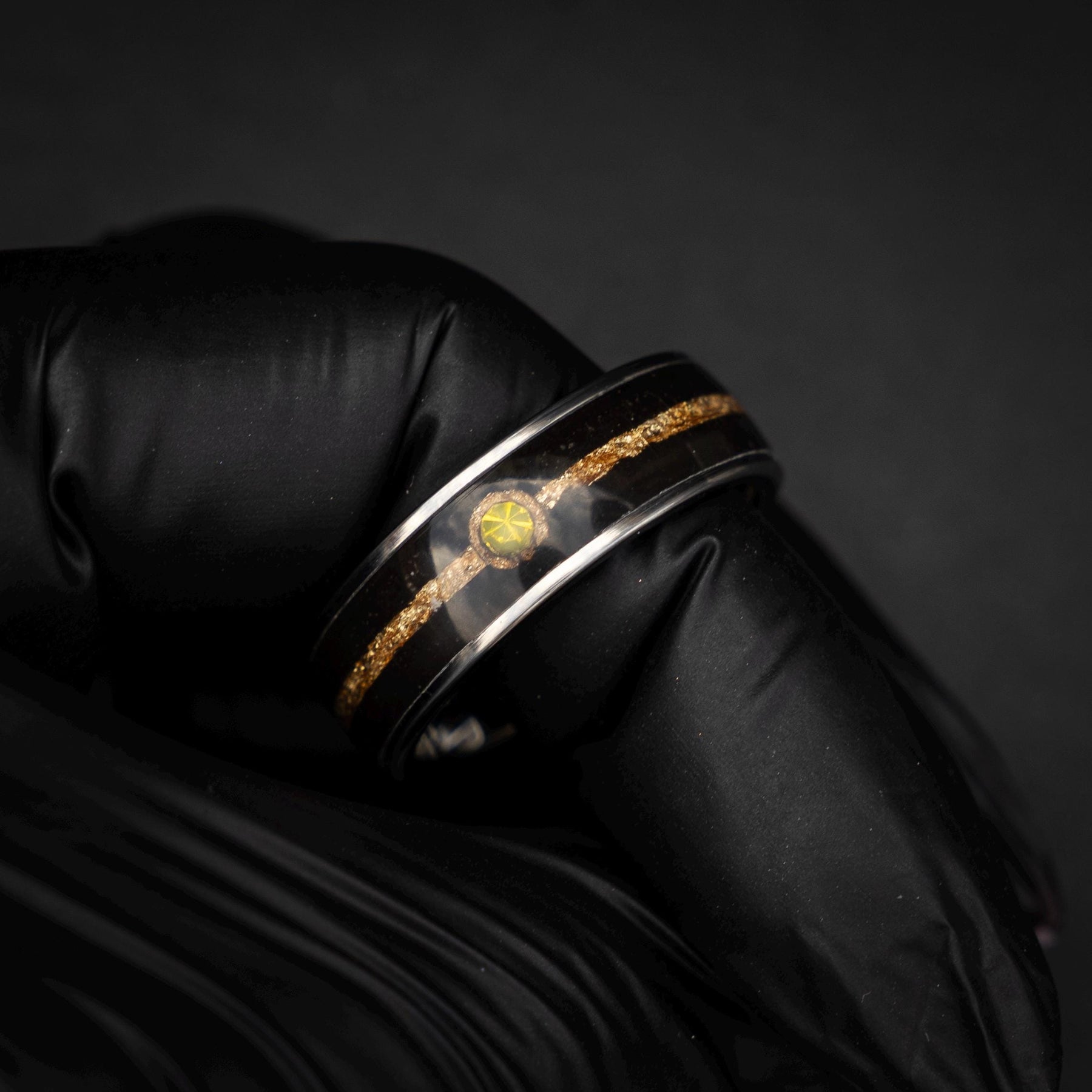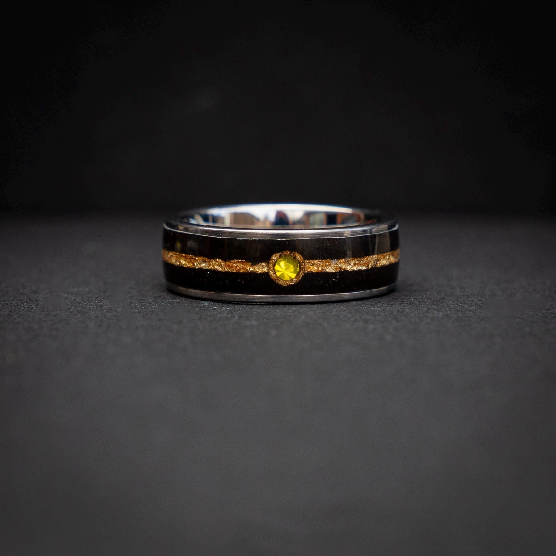 Inlay: Meteorite with 18k Gold Leaf and a Yellow Cubic Zirconia stone