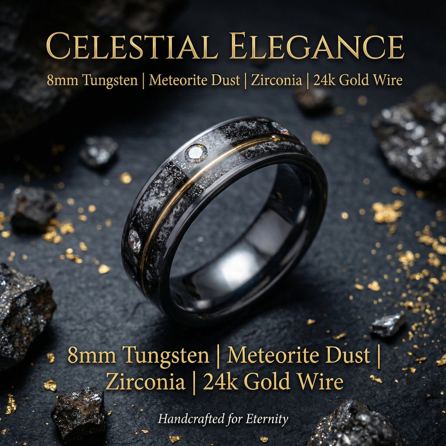Glow in the Dark Tungsten Ring Meteorite Inlay with cubic zirconia and 18K golden wire - New to our collection are rings with Cubic Zirconia. We have combined our popular meteorite ring with gold wrap with Zirconia stones. instead of a wrap, we added a thick gold wire offset from the middle so we could add the zirconia on the other side and still keep it in balance.