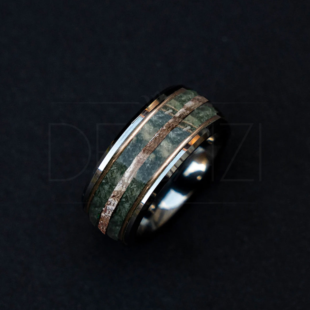 Beveled tungsten ring filled with moss agate, Spinosaurus and two 18k rose gold wires 10 mm width for Alex