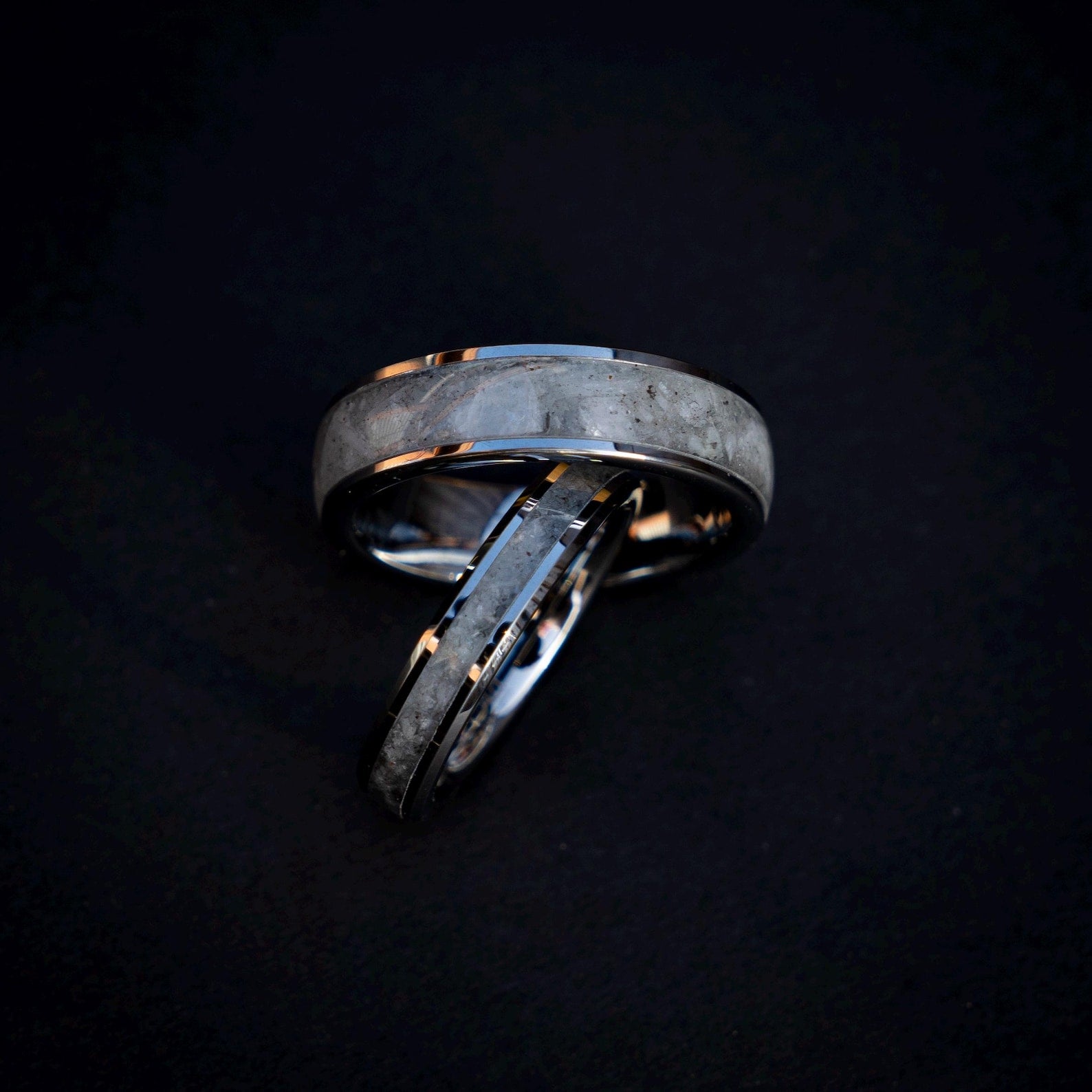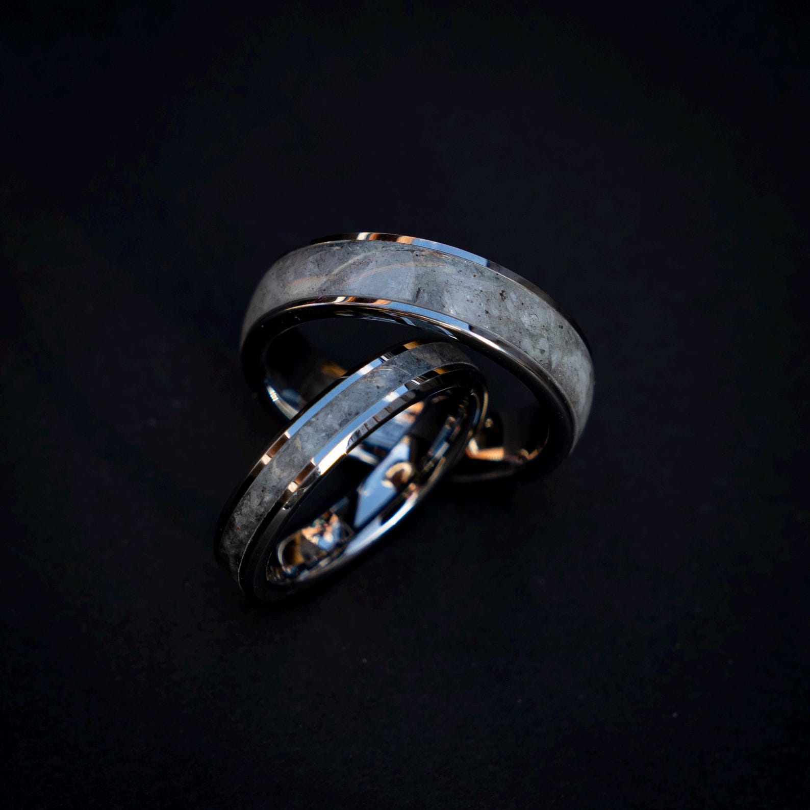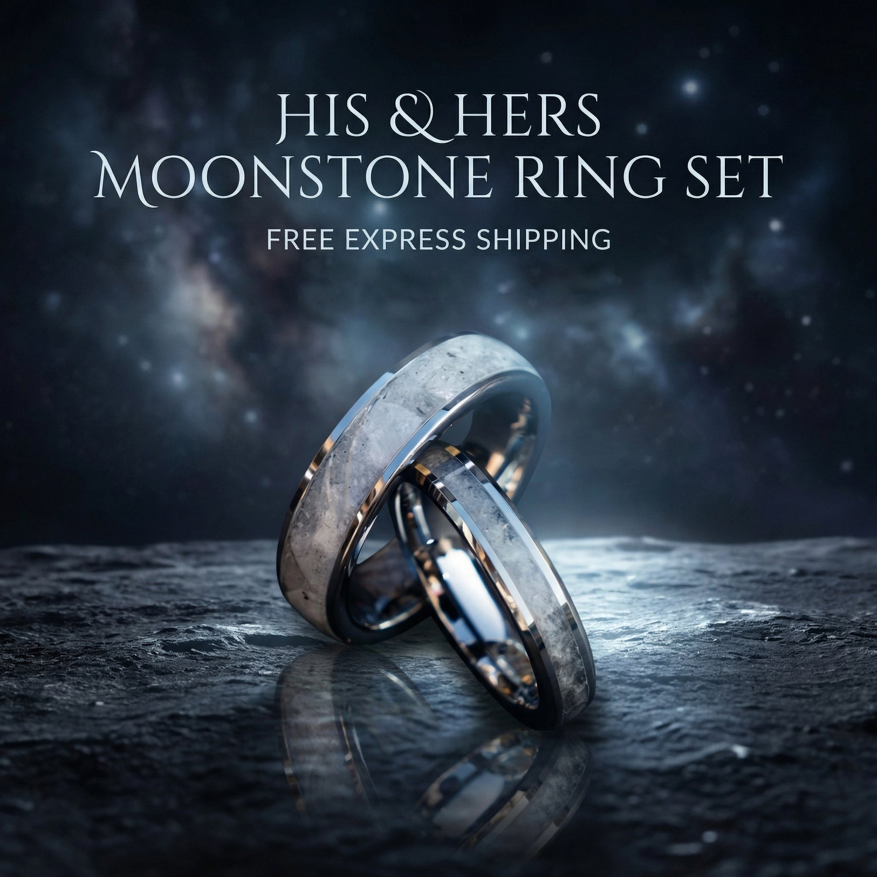 This silver tungsten ring set features a striking mix of rainbow moonstone and Muonionalusta meteorite for a bold and meaningful look. Made in matching 6 mm and 4 mm widths, both rings have a smooth comfort fit inside for comfortable everyday wear. A durable and unique choice for weddings, anniversaries, or couples who want something different.