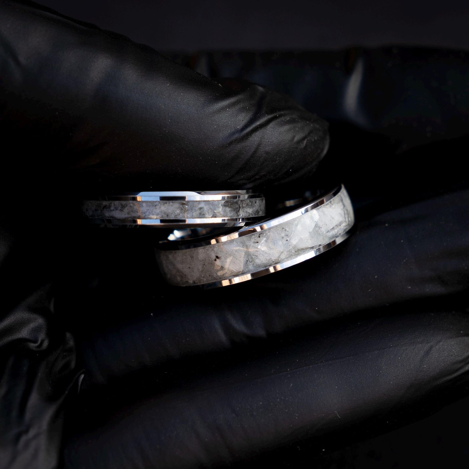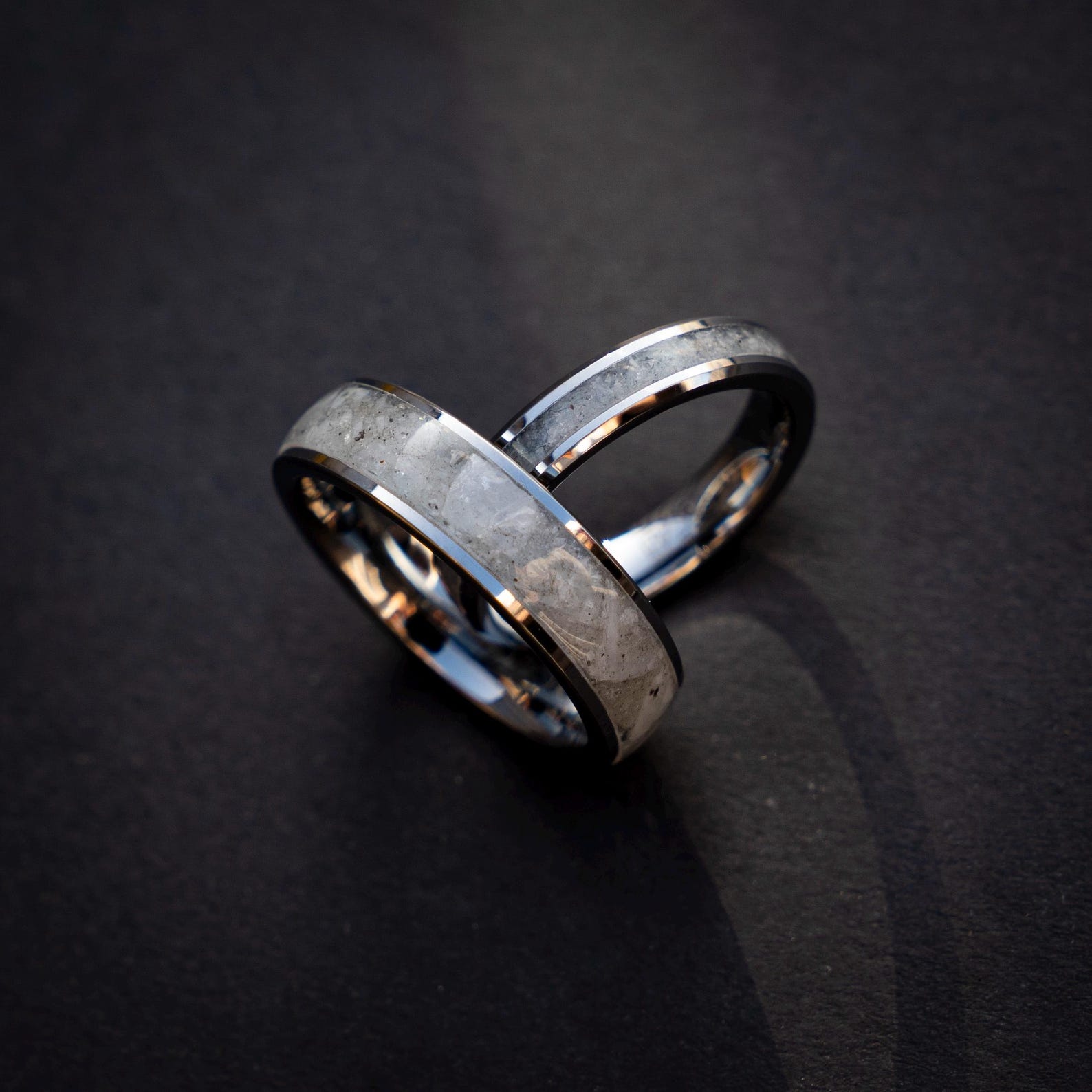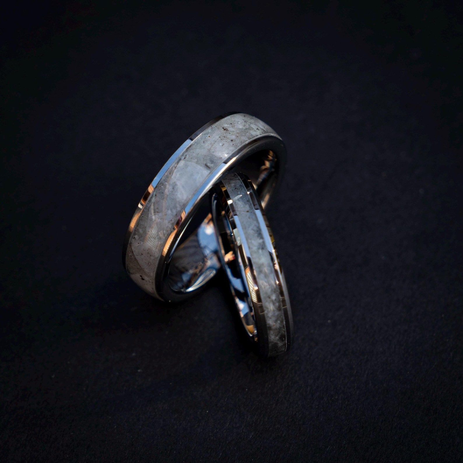 This silver tungsten ring set features a striking mix of rainbow moonstone and Muonionalusta meteorite for a bold and meaningful look. Made in matching 6 mm and 4 mm widths, both rings have a smooth comfort fit inside for comfortable everyday wear. A durable and unique choice for weddings, anniversaries, or couples who want something different.