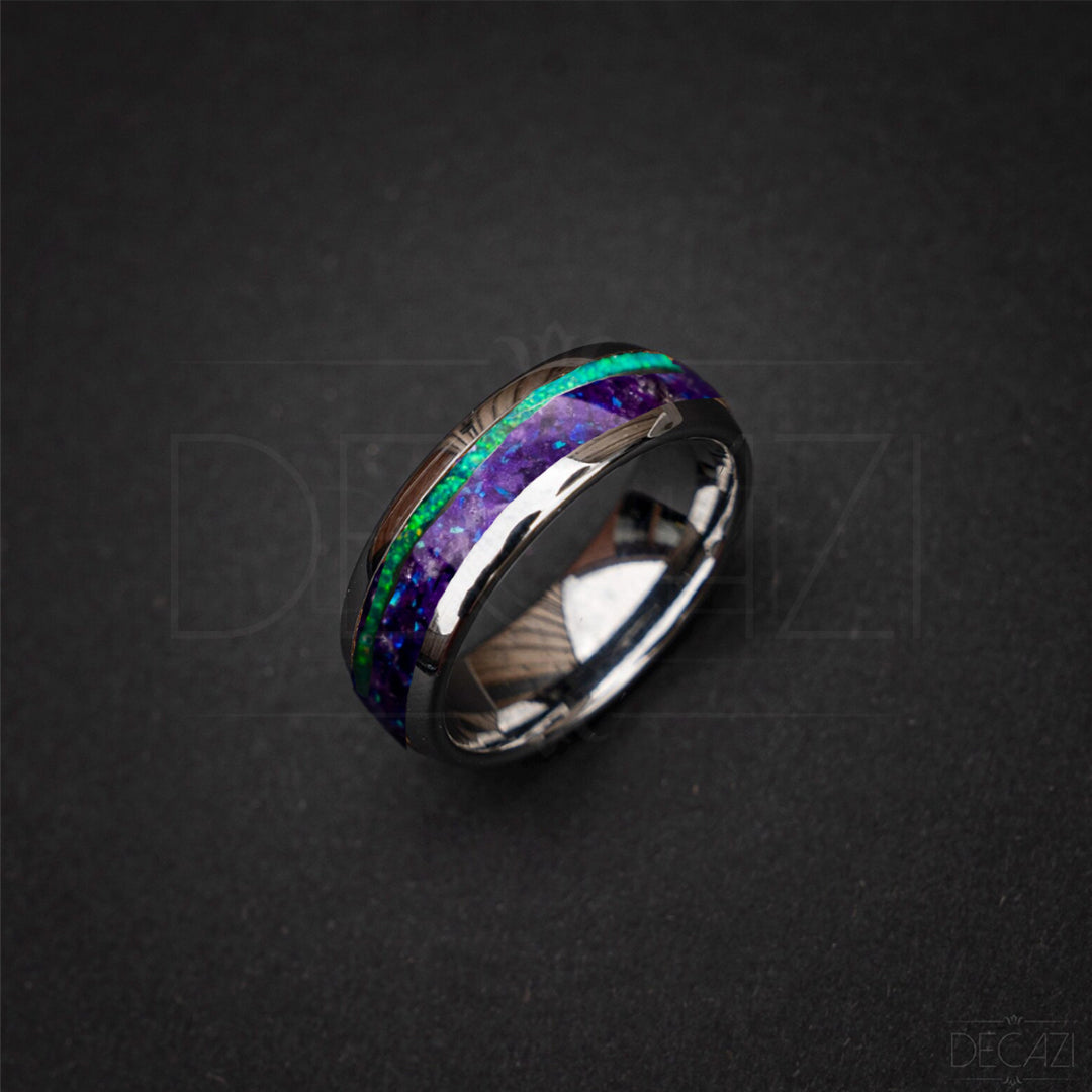 Domed tungsten ring filled with Purple Opal, Pigment and Amethyst with offset Blue Opal Line 8 mm for Mar Lee