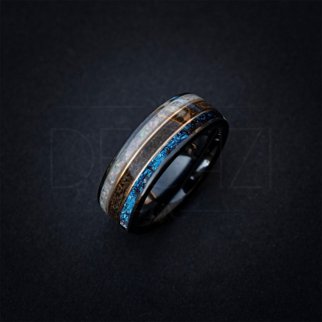 Flat ceramic ring filled with Moonstone, T-rex and Galaxy opal divided by two 18k yellow gold wire 8 mm for Wolf