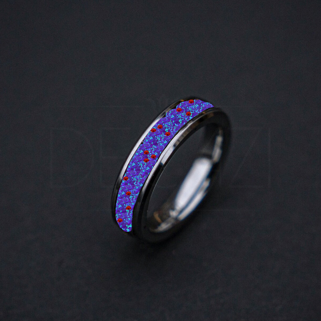 Beveled tungsten ring filled with sleepy lavender opal an sprinkles of red opal 6 mm for Dominique