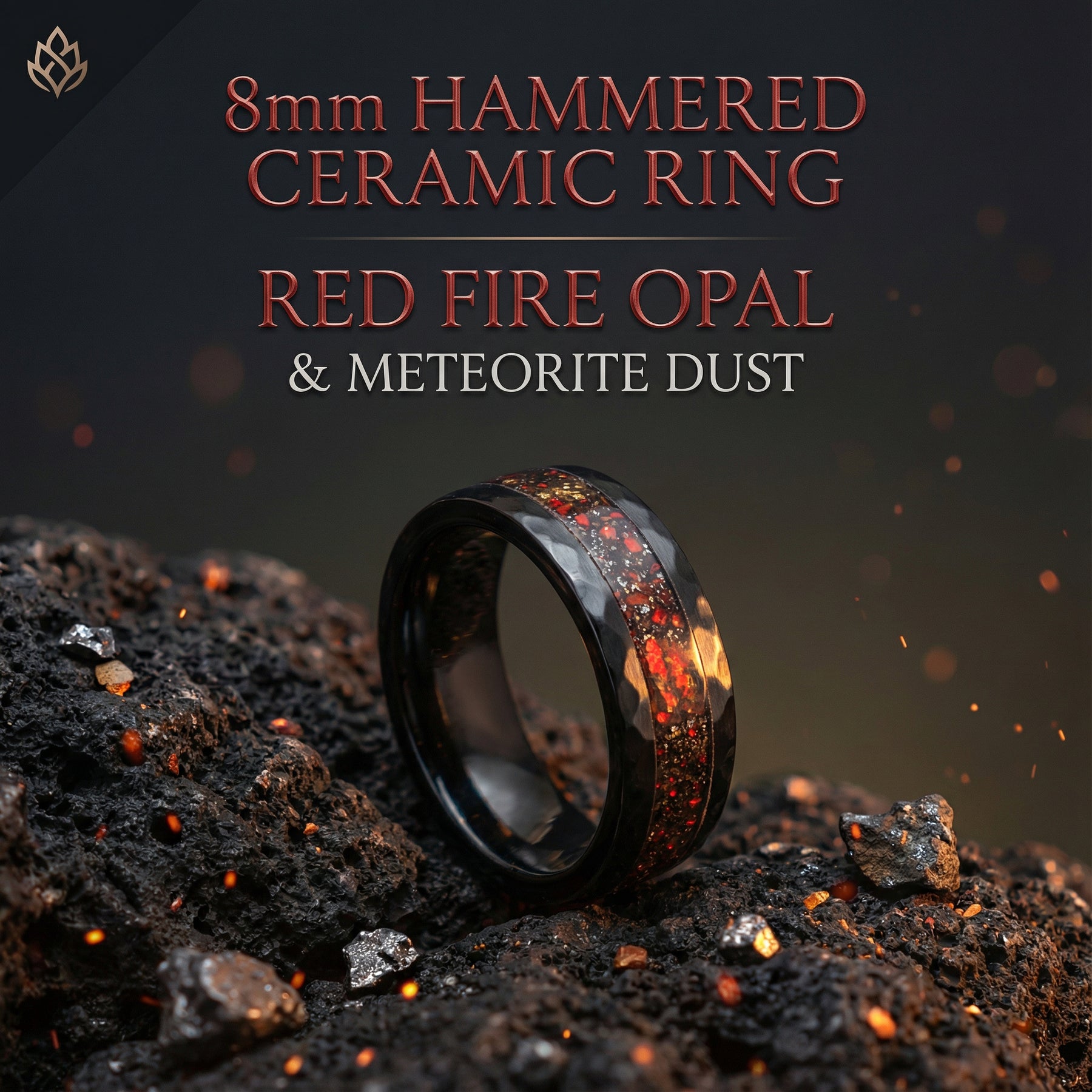 Black Hammered Ceramic Ring With Triceratops Meteorite & Opal