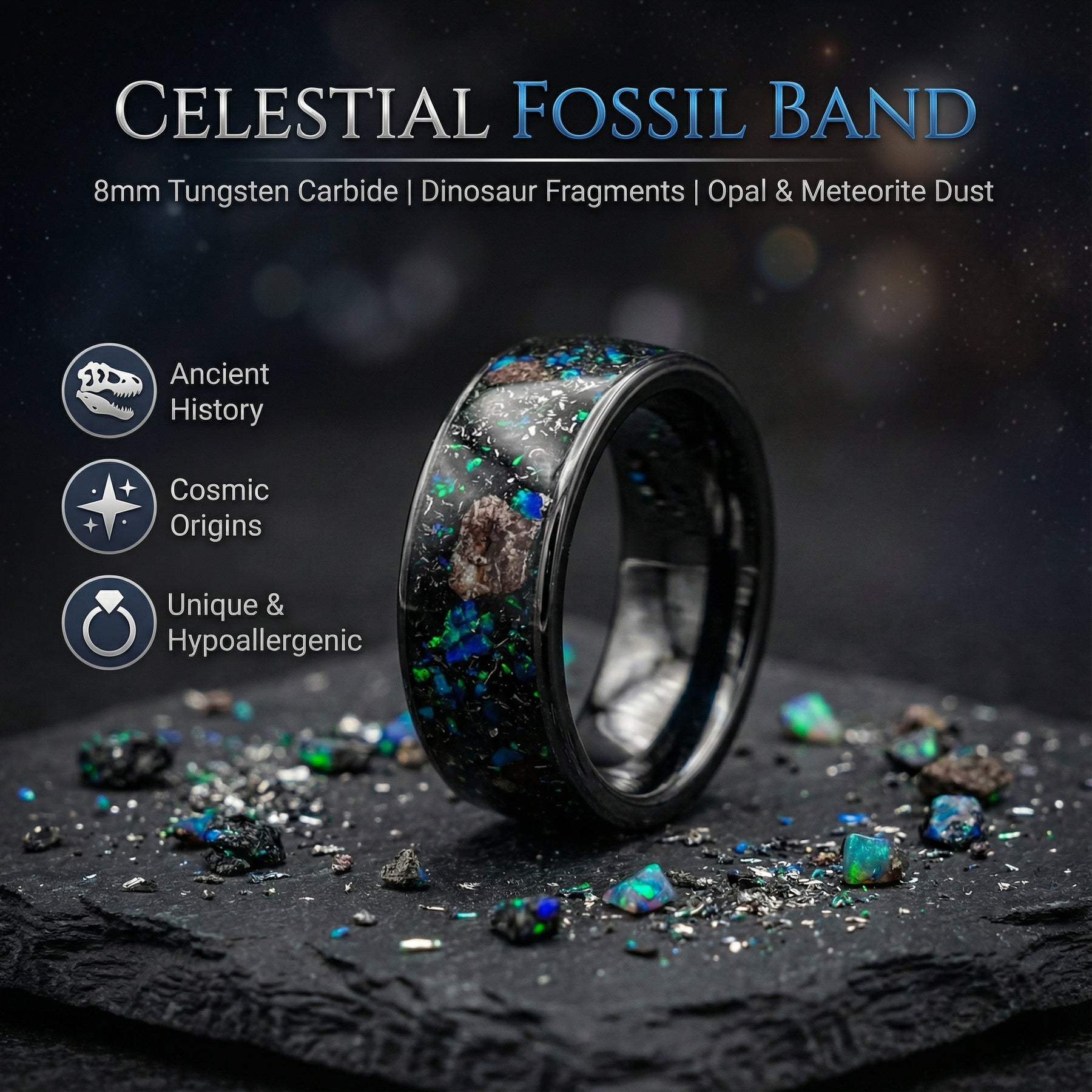 Ceramic Opal Ring Dinosaur Bone Fossil & Meteorite is the perfect wedding band, engagement ring and promise ring to make  your special day, proposal or announcement extraordinary.