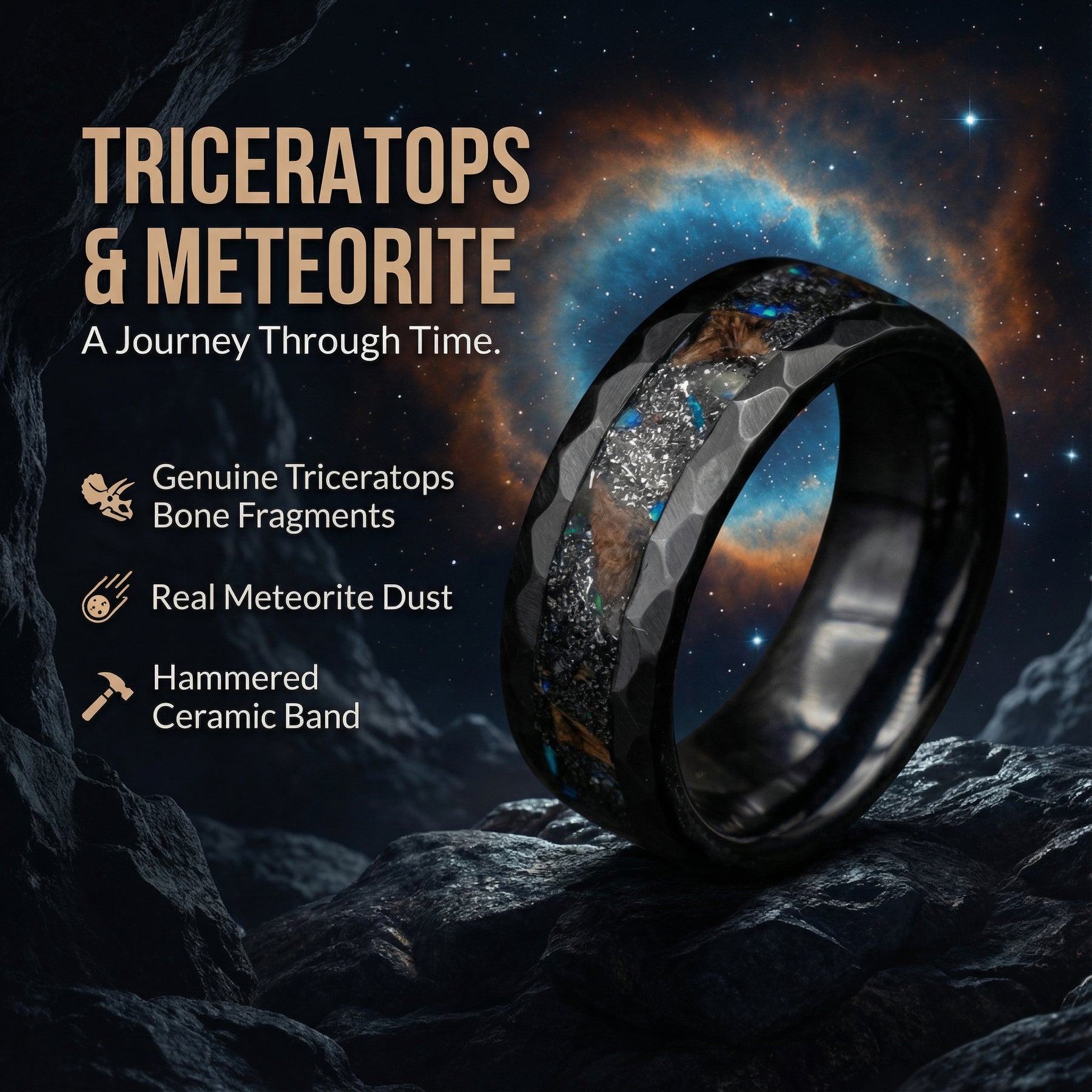 Hammered Ceramic Meteorite Ring With Opal Accents is a classic handcrafted ring that screams modern and sophisticated. Our Hammered Ceramic Meteorite Ring With Opal Accents as well as triceratops is uniquely styled and perfect for all occasion gifts or just anytime.