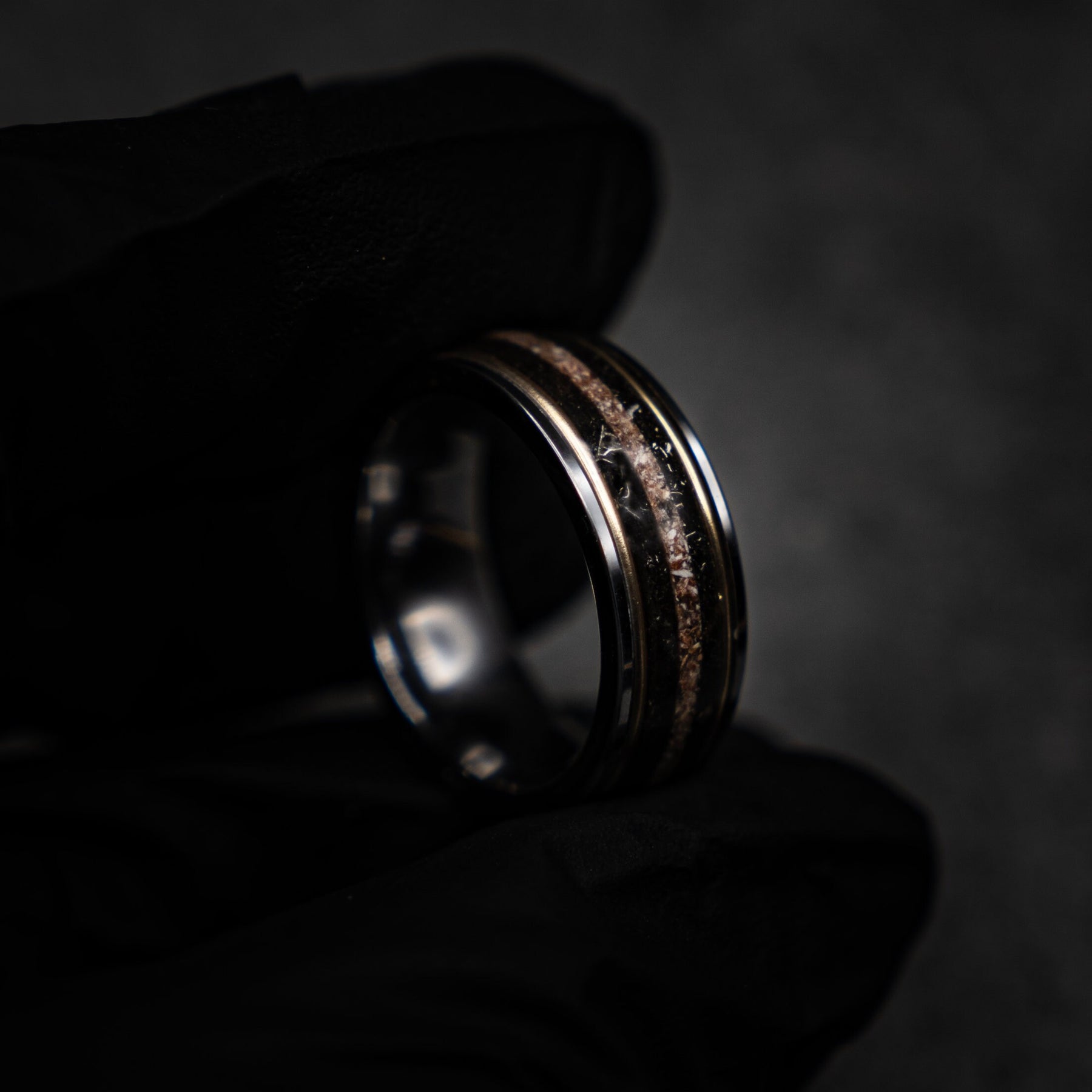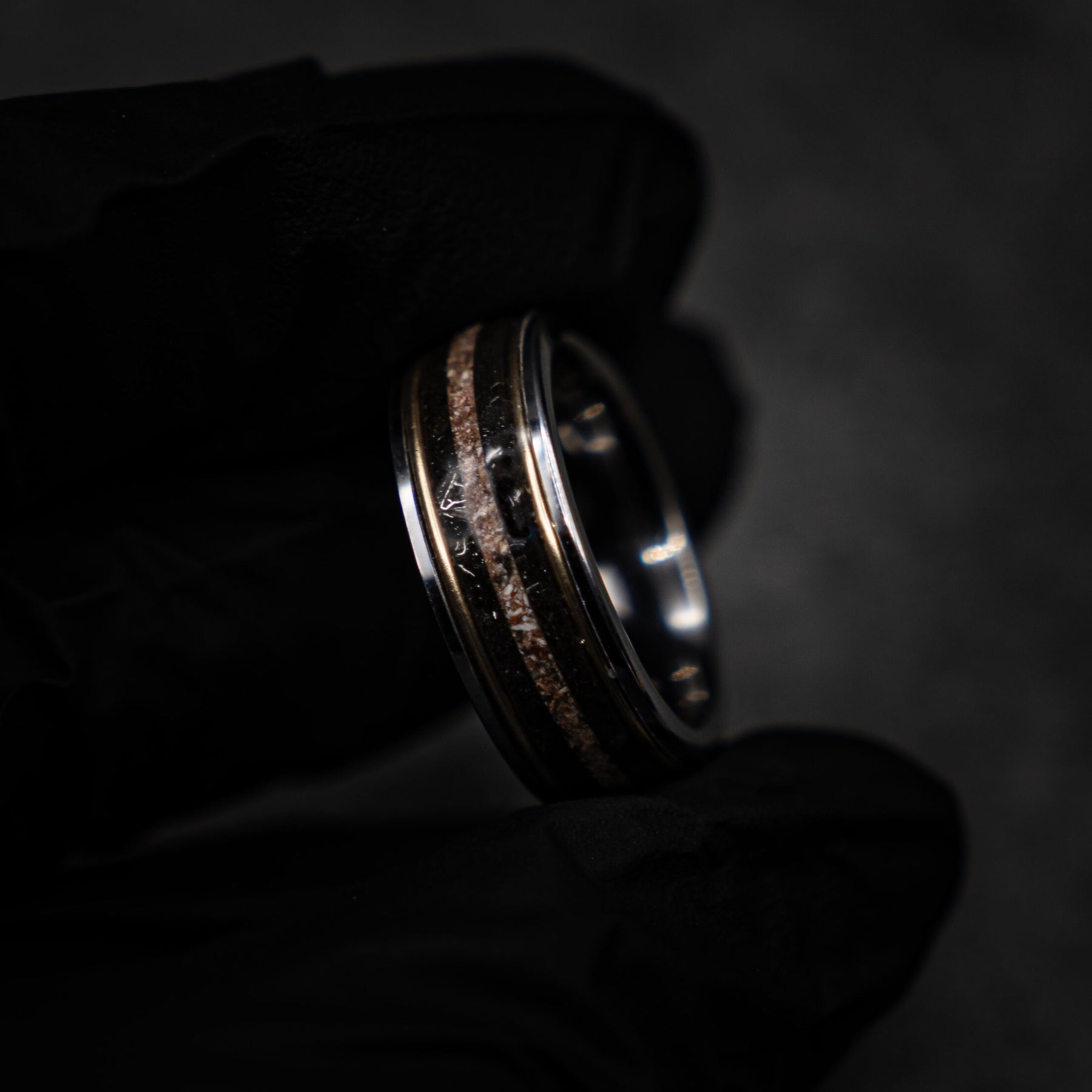 Silver tungsten dinosaur bone ring with Muonionalusta and 18ct golden wires