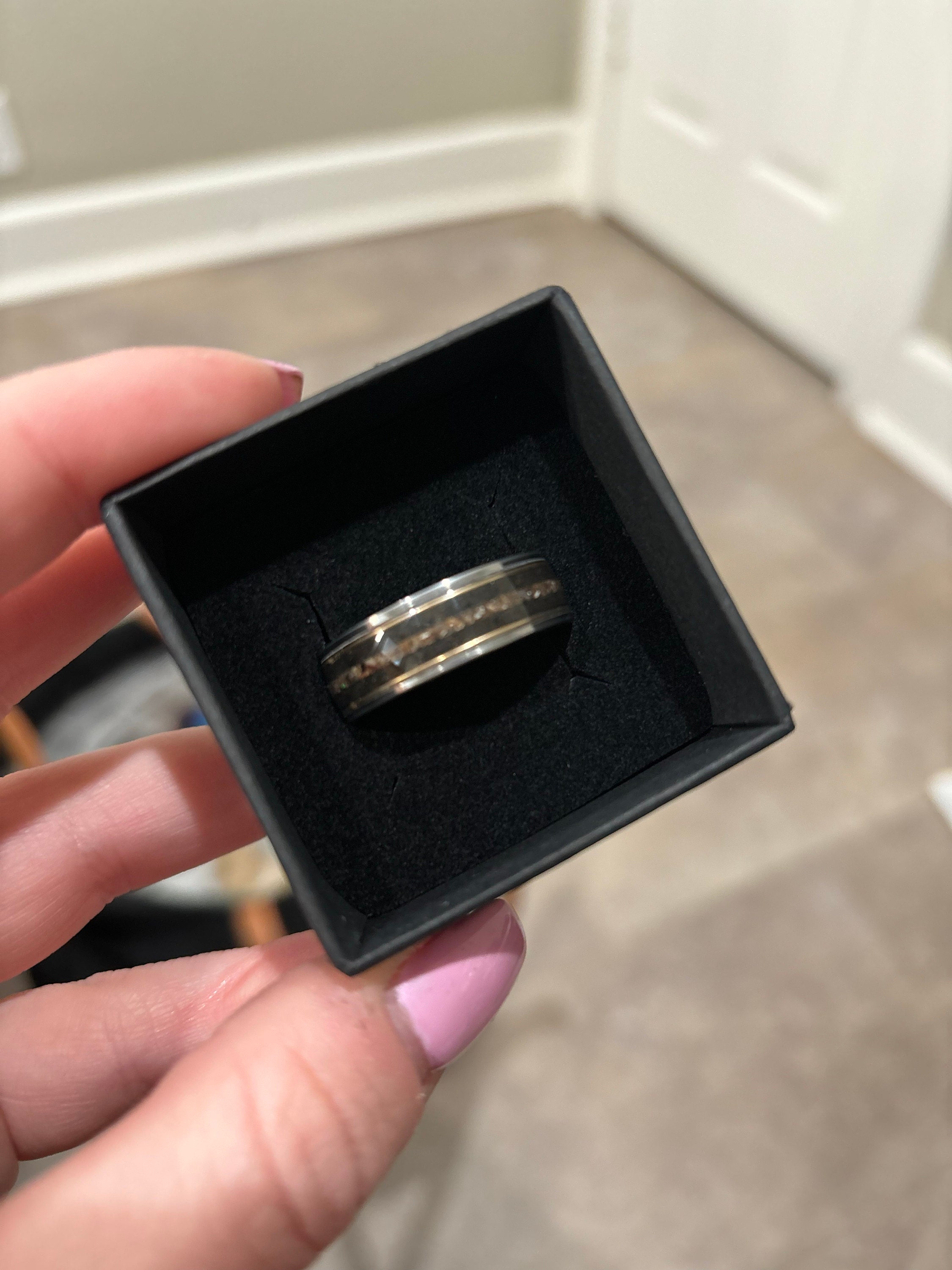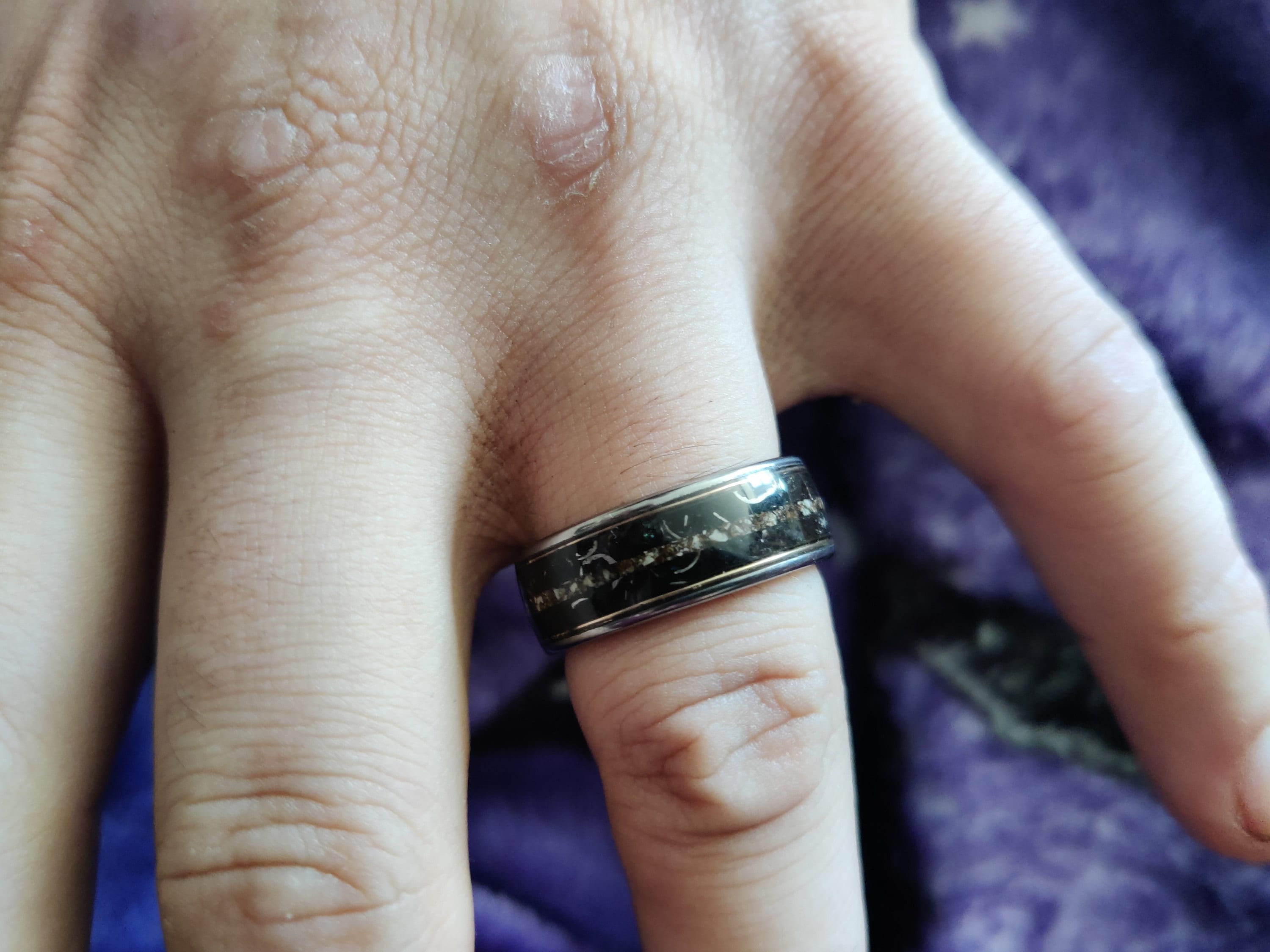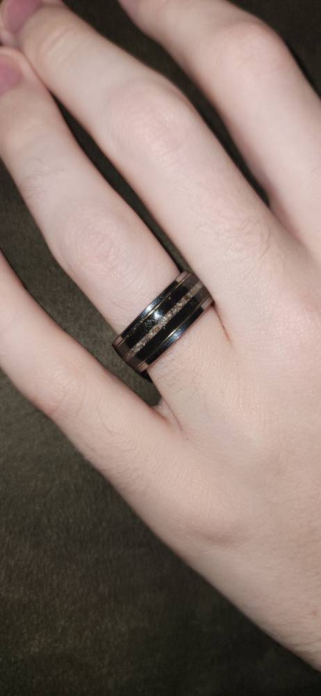 Our rings are handmade, we place the golden wire by hand in the inlay of the ring. A wire always has a beginning and end. We do our best to place these as close to each other as possible or to hide them. There may be a tiny space in between visible, that's the beauty of handmade products.