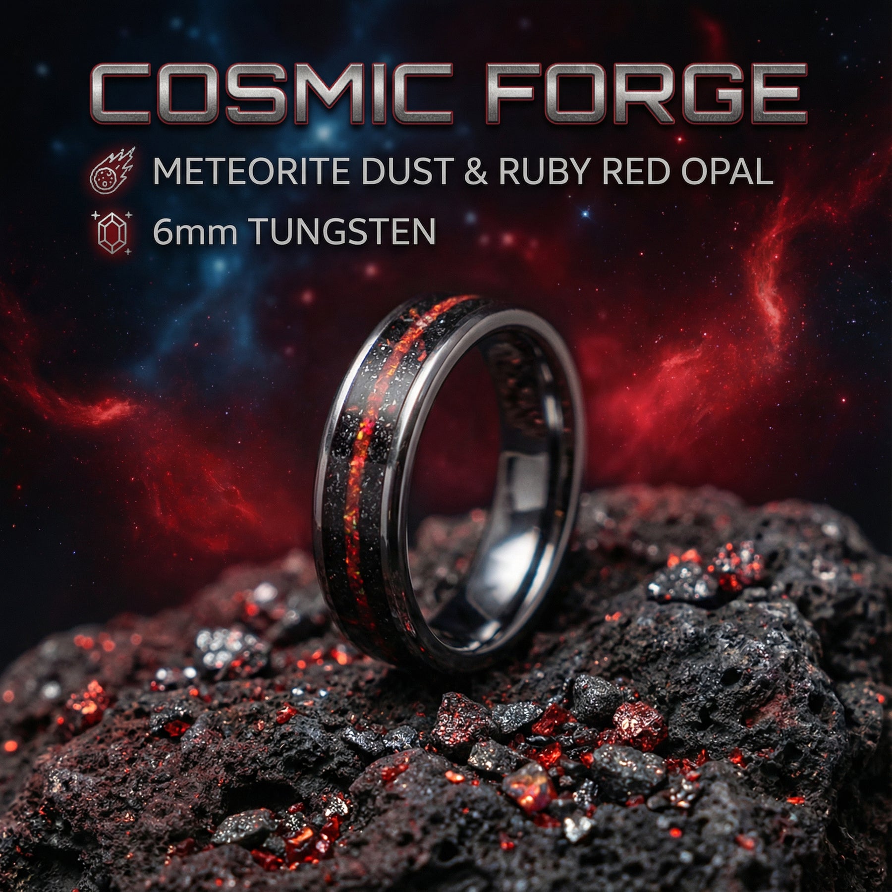 Red Opal & Meteorite Tungsten Mens Ring