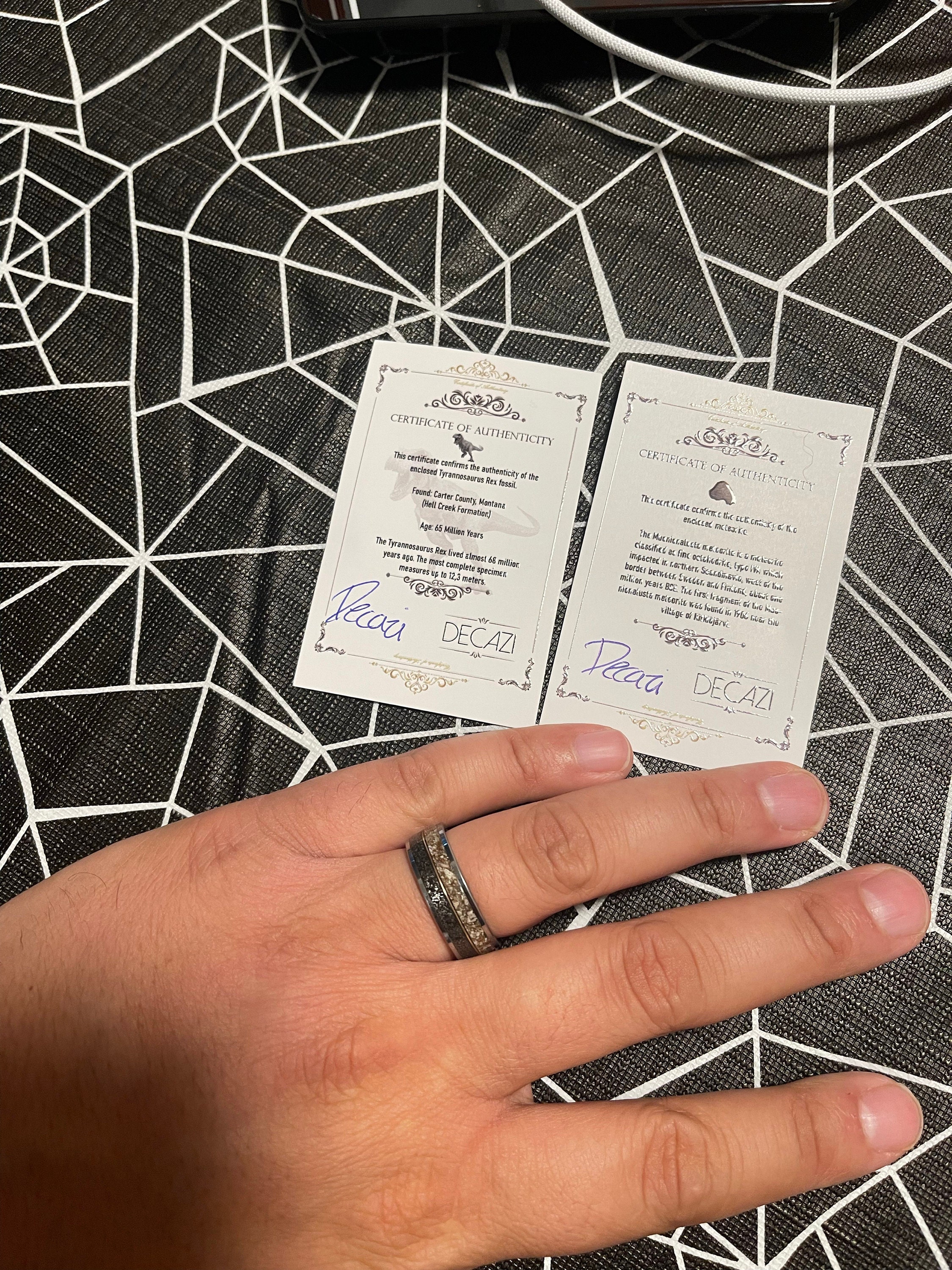 Rosana SerratoI recently bought this dinosaur bone and meteorite ring for my fiancé, and I couldn't be happier. He's a huge Jurassic park fan... Read MoreI recently bought this dinosaur bone and meteorite ring for my fiancé, and I couldn't be happier. He's a huge Jurassic park fan and loves space, the combination of ancient bone and cosmic meteorite is truly unique and stunning. The quality is exceptional and durable. I recommend to anyone who is looking for a more unique design and conversation piece. HidePosted on -
