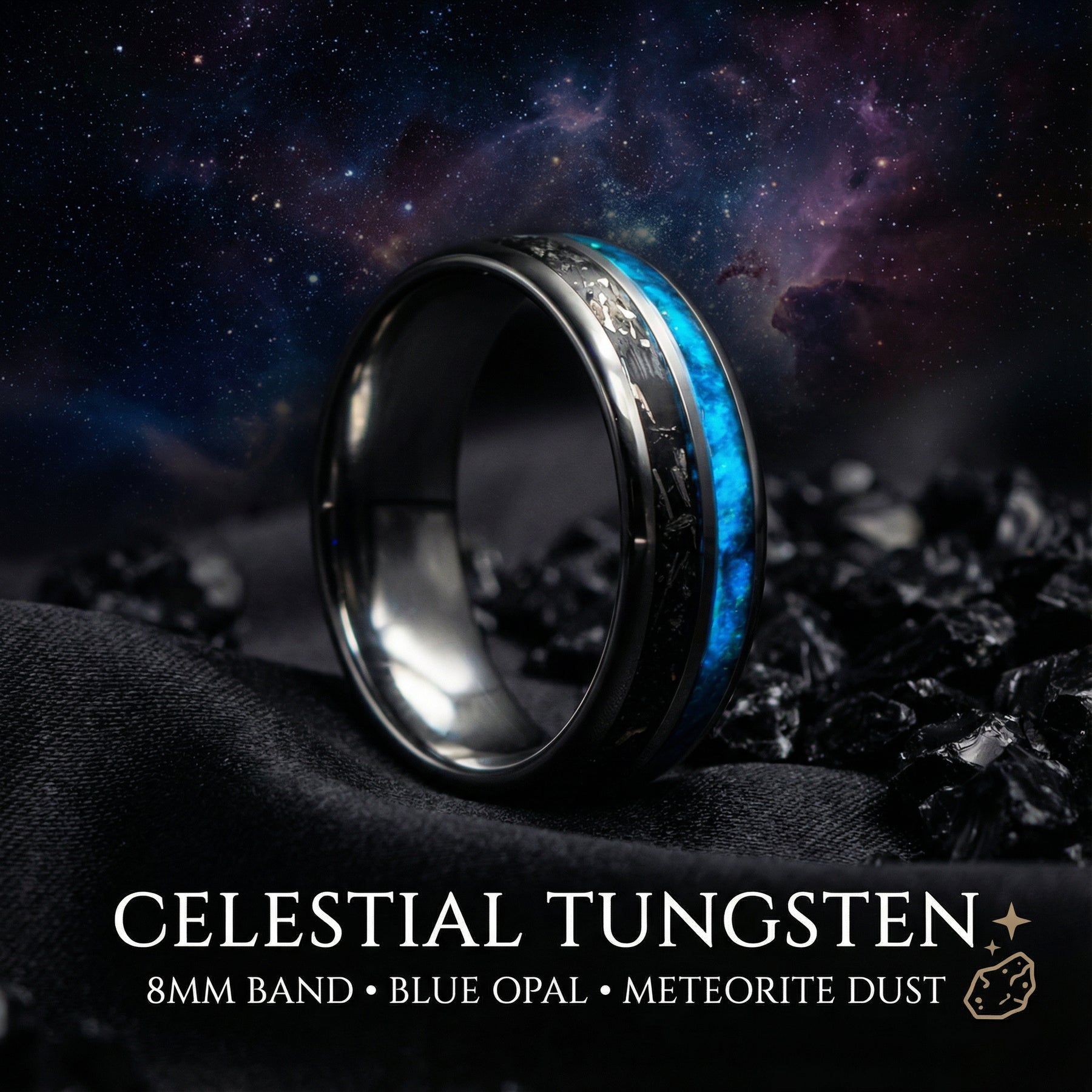 Tungsten double inlay with meteorite stardust and galaxy glow