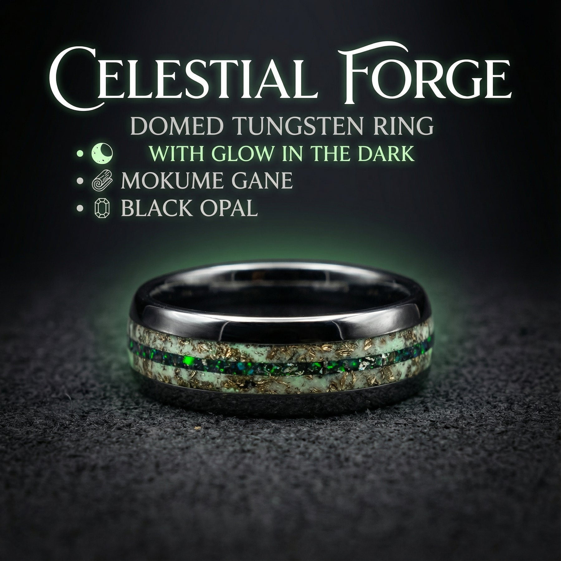 Inlay: Glow powder mixed with Mokume gane shavings and a black opal (green fire) mixed with meteorite line