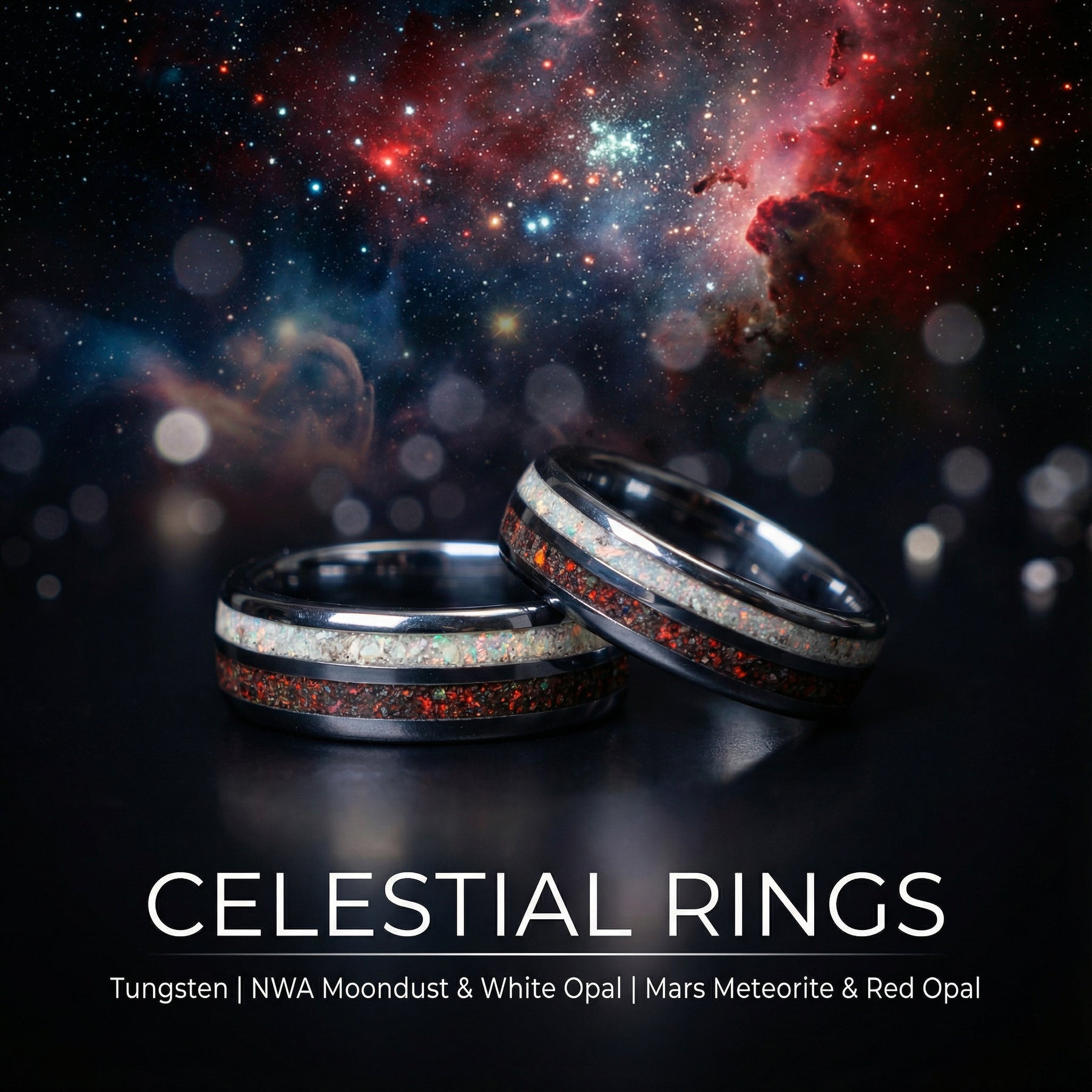 Tungsten ring set with Mars and Spinosaurus mixed with White Opal
